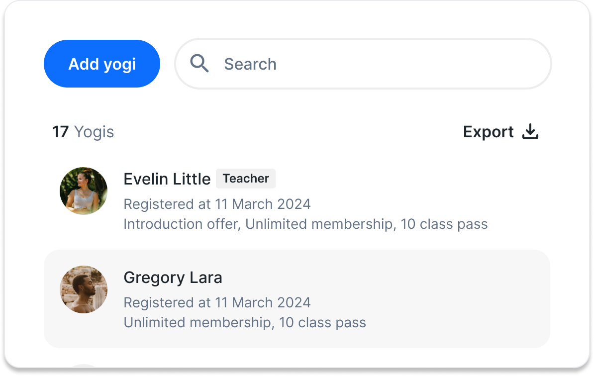 Du kannst Yogis hinzufügen, indem du ihren Vor- und Nachnamen sowie ihre E-Mail-Adresse eingibst. Danach kannst du ihrem Account Kurskarten und Mitgliedschaften zuweisen und diese Yogis zu Kursen hinzufügen. Das sorgt für einen reibungslosen Übergang. Natürlich verwalten deine Yogis ihre Accounts danach selbst.