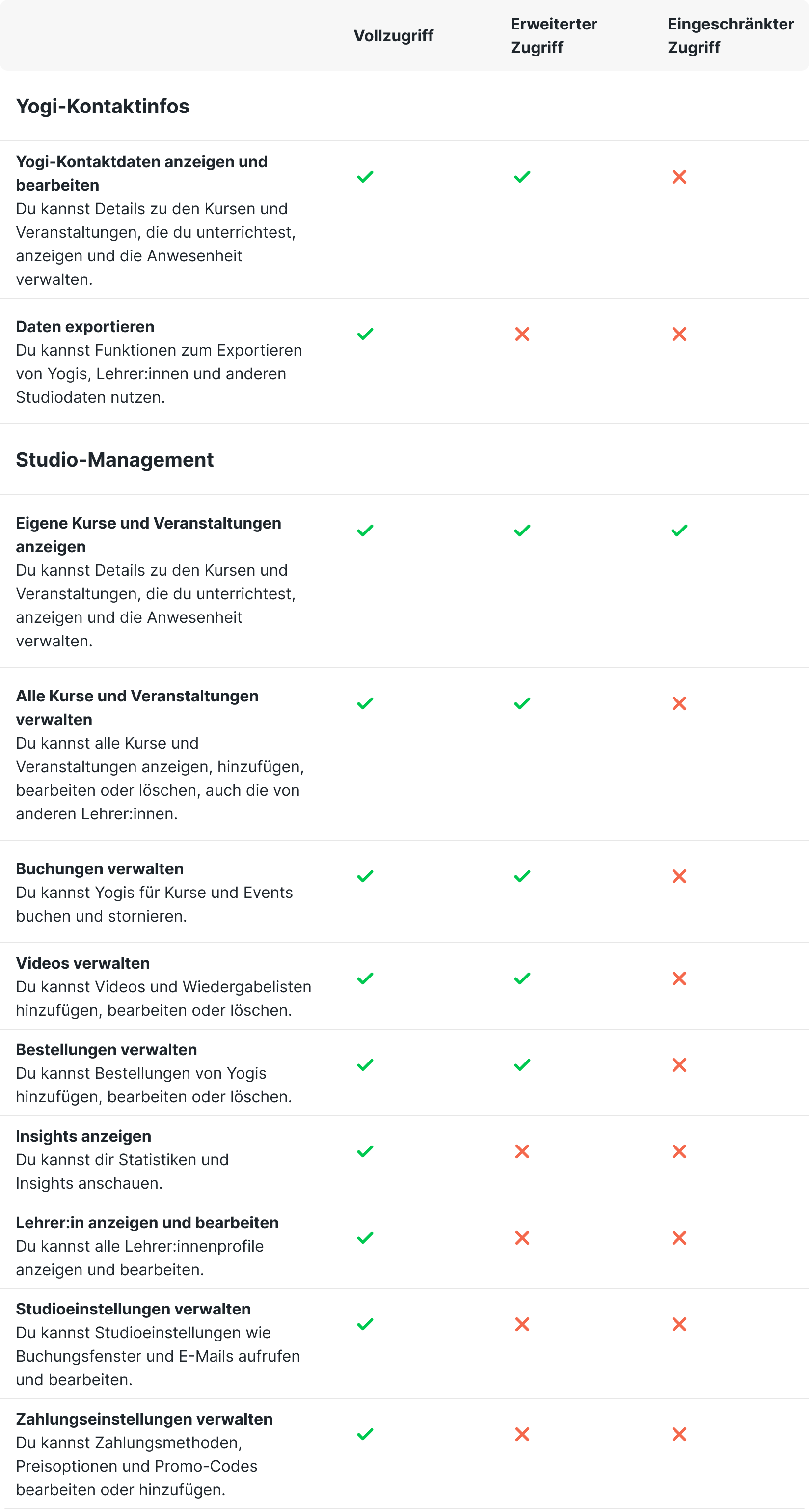 Lehrer:innen mit erweitertem Zugriff können Buchungen, Bestellungen und Kurse verwalten sowie die Kontaktdaten der Yogis einsehen und bearbeiten (ausgenommen Zahlungsinformationen). Sie haben jedoch keinen Zugriff auf allgemeine Studioeinstellungen wie das Buchungsfenster, anpassbare E-Mails oder Preisoptionen.