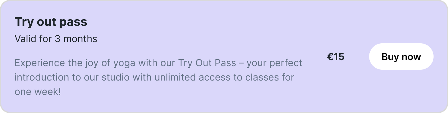 Pay-what-you-can-Kurse fördern Inklusivität und Zugänglichkeit und eignen sich daher ideal für Community-Sessions, Outdoor-Events oder besondere Anlässe. Sie fördern zwar das Engagement der Community, aber die Einnahmen sind weniger vorhersehbar, und einige Teilnehmer:innen zahlen möglicherweise zu wenig, wenn die Richtlinien nicht klar sind. Am besten legst du einen empfohlenen Spendenbereich fest (z. B. 10–15 €), damit die Teilnehmer:innen wissen, was erwartet wird. Diese Kurse funktionieren am besten neben regulären kostenpflichtigen Kursen, anstatt diese zu ersetzen, sodass dein Studio ein stabiles Einkommen behält und gleichzeitig die Zugänglichkeit fördert.