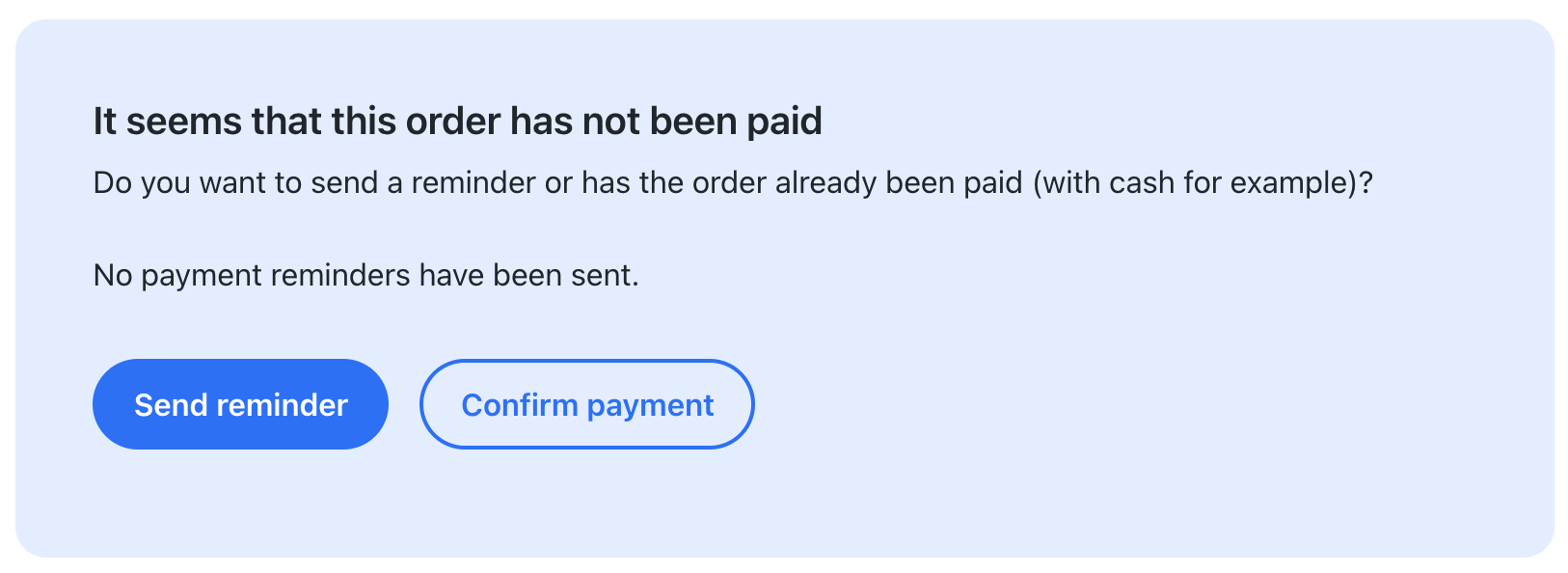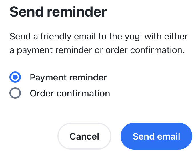 - You have the option to either send a payment reminder or an order confirmation. The order confirmation does not include a payment link, while the payment reminder will include a link for the yogi to complete the payment.