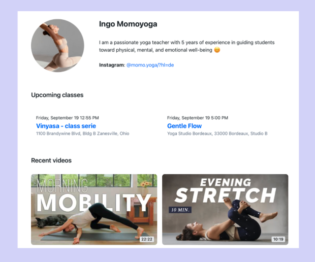 When yogis click on a class on your schedule, a Read more link appears below the teacher’s name. Selecting this link opens the teacher’s profile, where they can view upcoming classes, recent videos, and a short bio of the teacher.