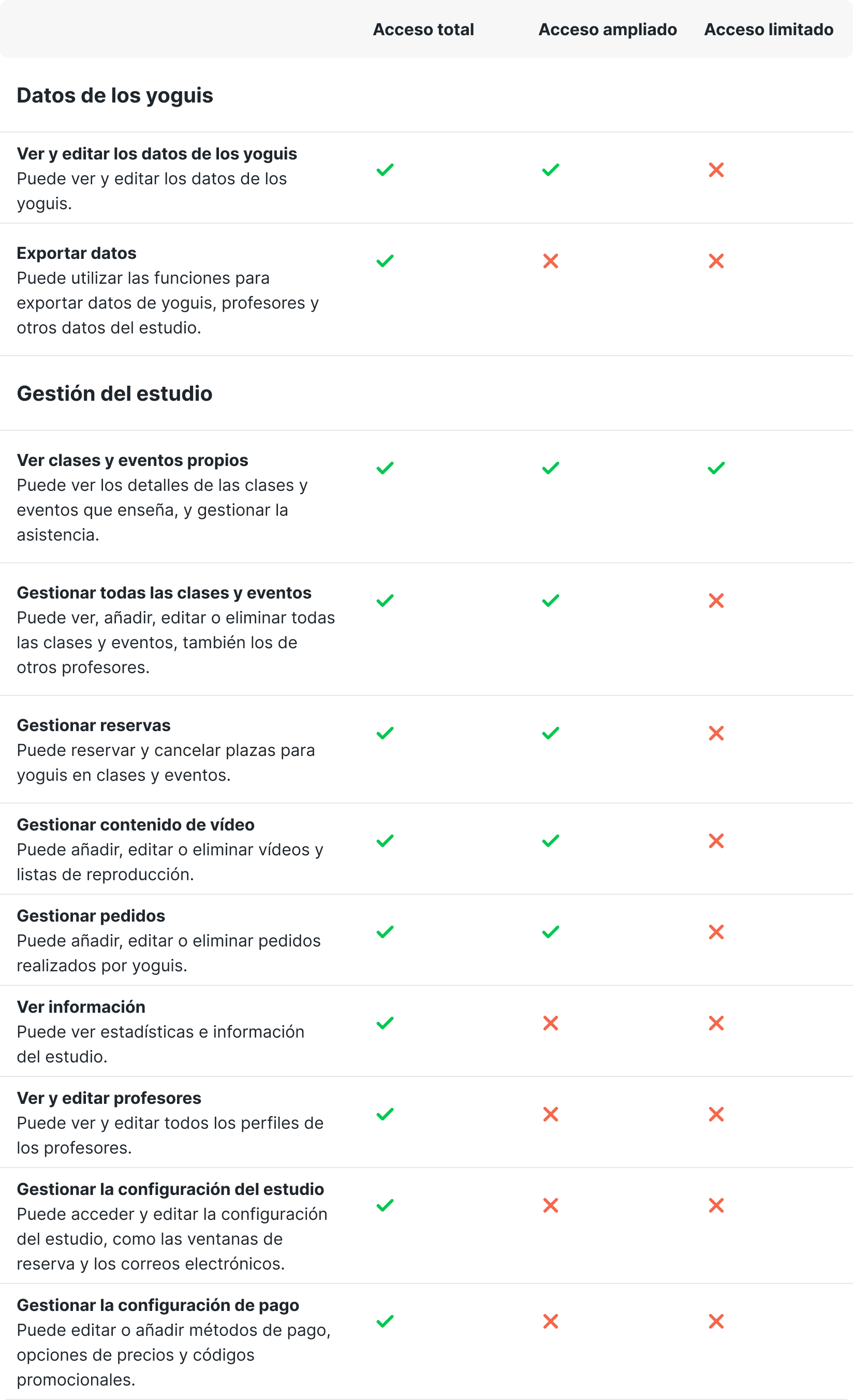 Hay tres niveles de acceso que puedes asignar a los profesores en Momoyoga: