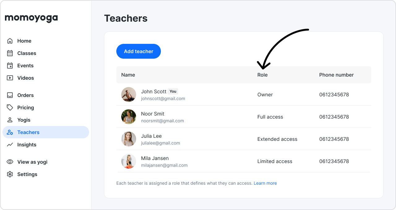 Los profesores con acceso ampliado pueden gestionar reservas, pedidos y clases, así como ver y editar los datos de contacto de los yoguis (excepto la información de pago). Sin embargo, no pueden acceder a la configuración general del estudio, como la ventana de reservas, los correos electrónicos personalizables o las opciones de precios.