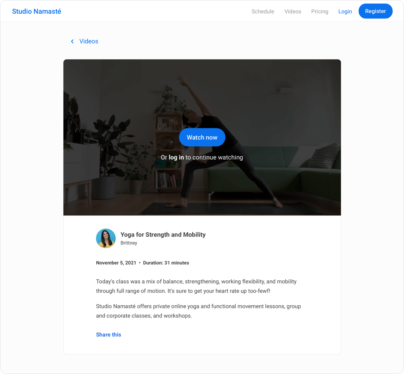 Lorsqu’ils cliquent sur la vignette d’une vidéo, ils sont redirigés vers la page de détails de la vidéo. Avant de pouvoir regarder la vidéo, les yogis doivent se connecter ou s’inscrire et, si la vidéo n’est pas gratuite, acheter un abonnement incluant l’accès aux vidéos.