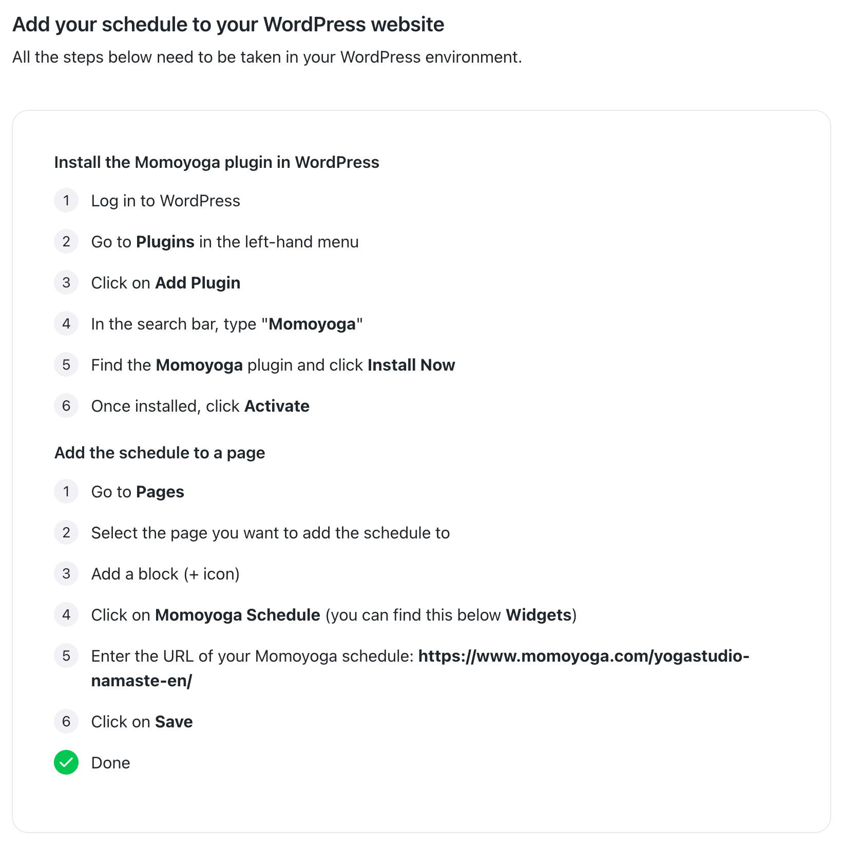 Vous pouvez facilement intégrer votre calendrier Momoyoga à votre site Web à l'aide du plugin WordPress. Nous proposons également d'autres options d'intégration de calendrier telles que Squarespace, Wix.com, Joomla et JavaScript.
