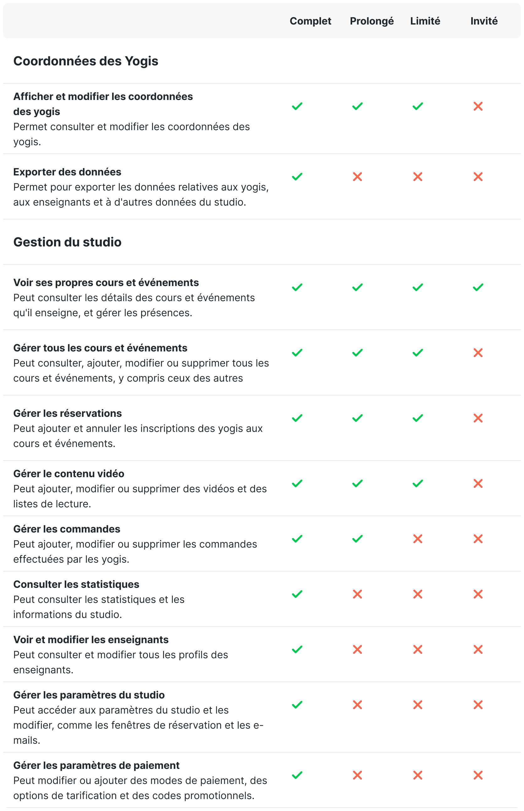Ce rôle est destiné aux enseignants invités qui n’ont besoin de voir que leurs propres cours. Ils ne peuvent pas gérer le planning, consulter les commandes, voir les informations des yogis ni contacter les yogis. Cependant, ils peuvent prendre les présences pour leurs propres cours.