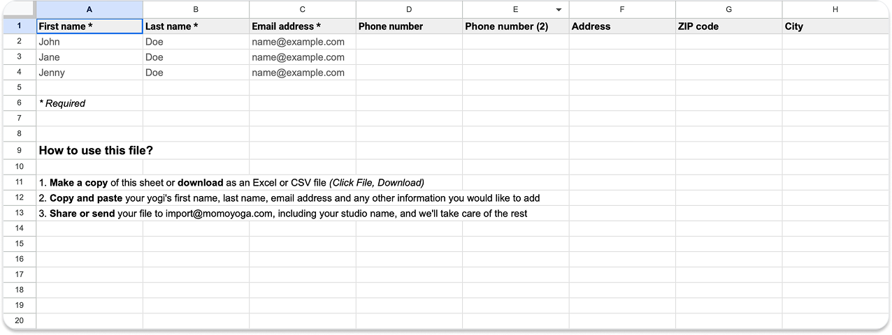 Je hoeft slechts één eenvoudige stap te nemen: exporteer je leden vanuit je huidige systeem. Het maakt niet uit of het een Excel bestand is of een ander beheersysteem. Als je alle informatie hebt verzameld, kun je dit voorbeeld bestand invullen en naar import@momoyoga.com sturen. Wij zorgen ervoor dat je yogi's zo snel mogelijk worden toegevoegd aan je studio account.